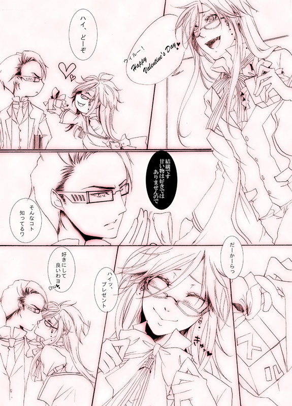 何ともベタなネタですみません。かれこれ5年くらい?毎年バレンタインと言えばバレキス聴いてた人間なのでバレンタインと言えばバレキスです。グレルにリボン掛けちゃいましたww上のグレルのお洋服がストライプ柄なのはそういうことです。いつか「バレンタイン・キッス」byグレル・サトクリフwith死神派遣協会が発売されるって信じてる!!Kill in~みたいな福潤の声でww