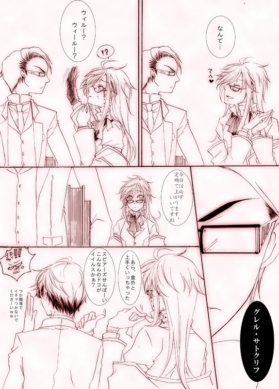 薄々思ってはいたんですけど、これ描いててうちのウィリアムさんむっつりやなーって確信しました。定時に上がってそのままグレルお持ち帰りです。毎度ありがとうございましたー!チャリーン イチャつくのはお家に帰ってからにして下さい(by死神派遣協会一同/げんなり)